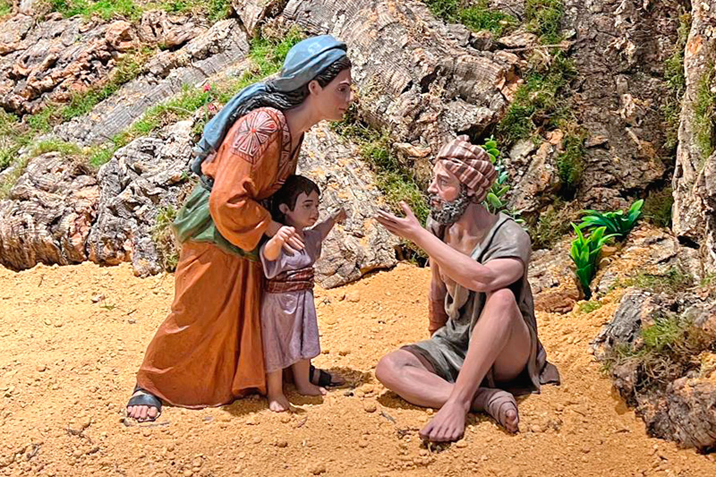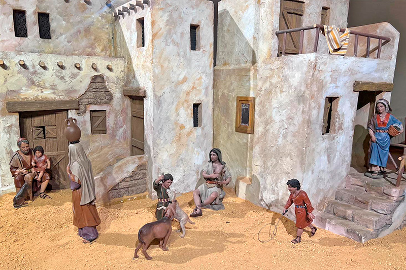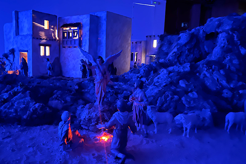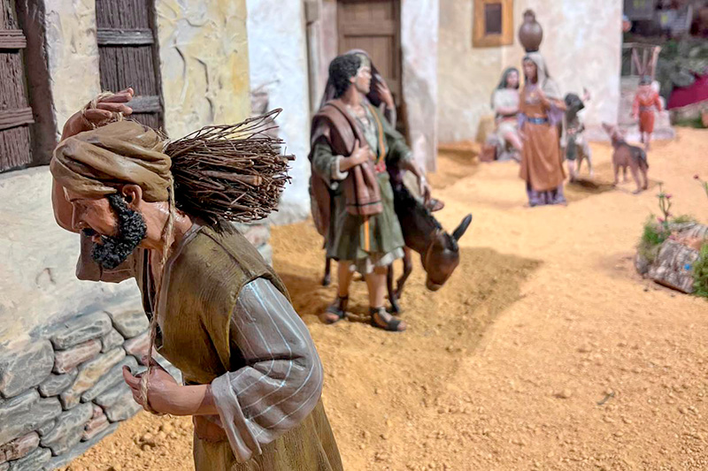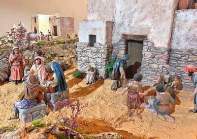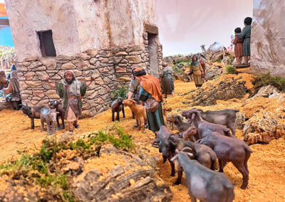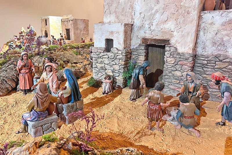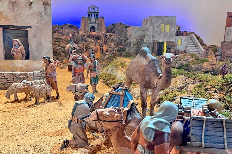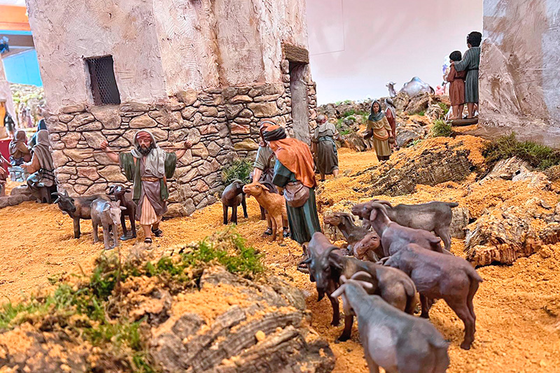 De los 24 m2 de escenografía en su primer enclave en la capilla de San Pedro, en 2018, se ha ampliado su paisaje y superficie hasta los 45 m2 actuales. Empleando materiales naturales (corcho, musgo, arena, piedras y ramas), se han representado diferentes elementos del paisaje y la arquitectura, como laderas, montes, caminos y plazas.